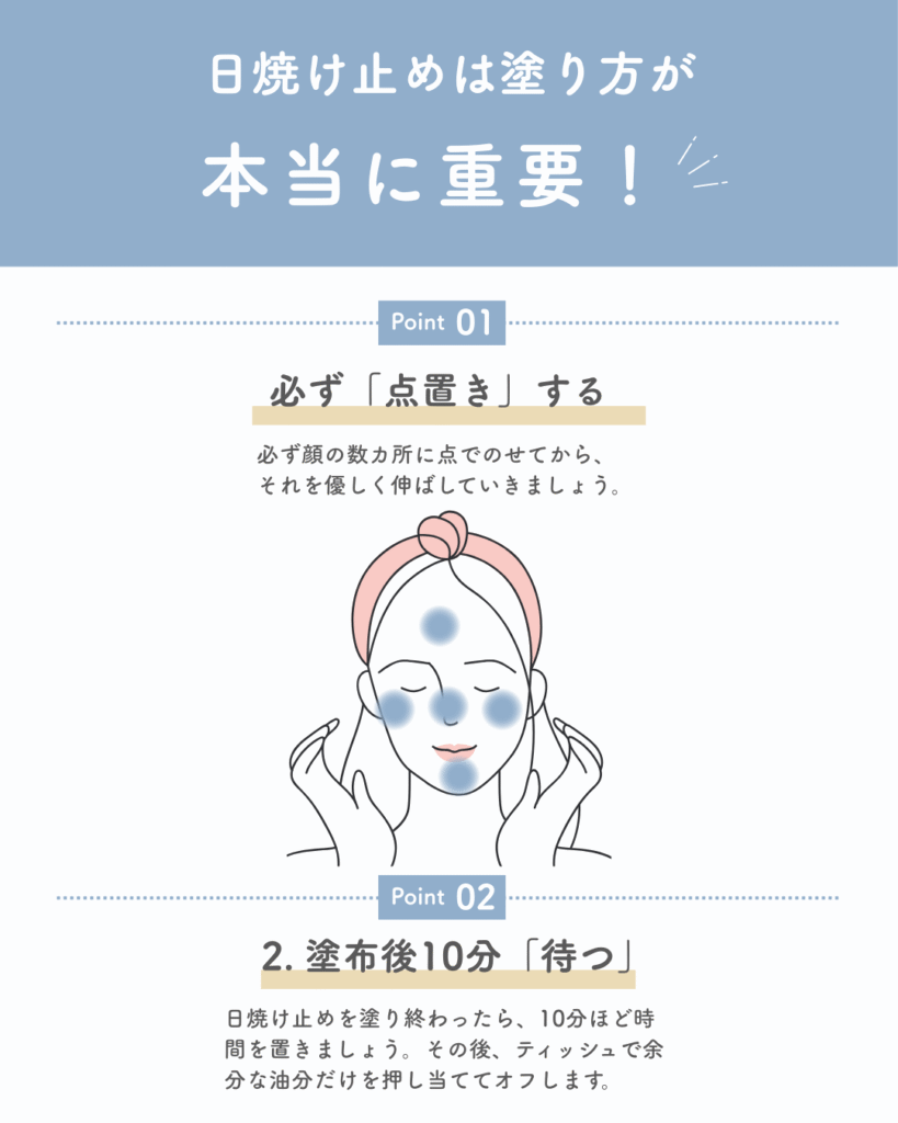 2. 塗布後10分「待つ」 スキンケアを終え、日焼け止めを塗り終わったら、すぐにメイクを始めるのではなく、10分ほど時間を置きましょう。その後、ティッシュをひし形に折り、顔に優しく押し当てて余分な油分だけをオフします。膜が肌にしっかり定着するのを待つことで、防御効果を損なわずに美しい仕上がりを両立できます。